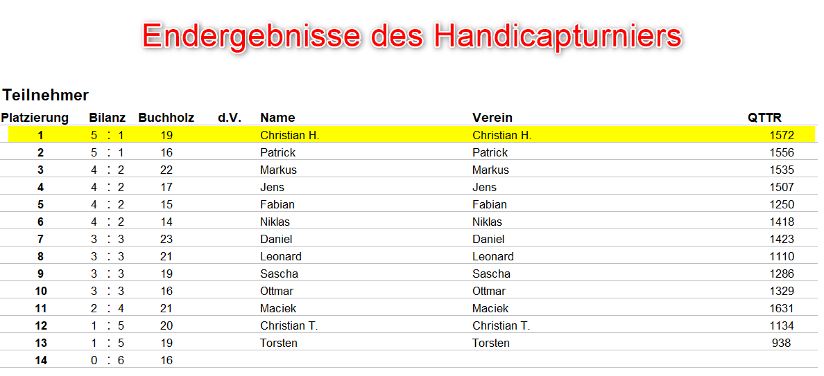 Gesagt – getan, am letzten Montag haben wir das Handicapturnier also auf die Beine gestellt. Nach Ausrechnung der TTR Punkte Differenz zwischen den Spielern musste der bessere Spieler dem Gegner maximal bis zu sechs Punkte pro Satz vorgeben. Aufgrund des Schweizer Systems wurden dann insgesamt sechs Durchgänge gespielt und man spielte dadurch automatisch immer gegen einen gleich guten Gegner. Meint, hat man selbst ein Spiel verloren und zwei gewonnen, dann spielt man im nächsten Durchgang gegen einen mit derselben Spielbilanz.