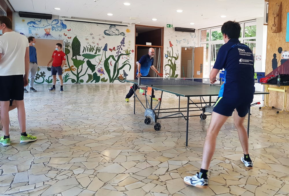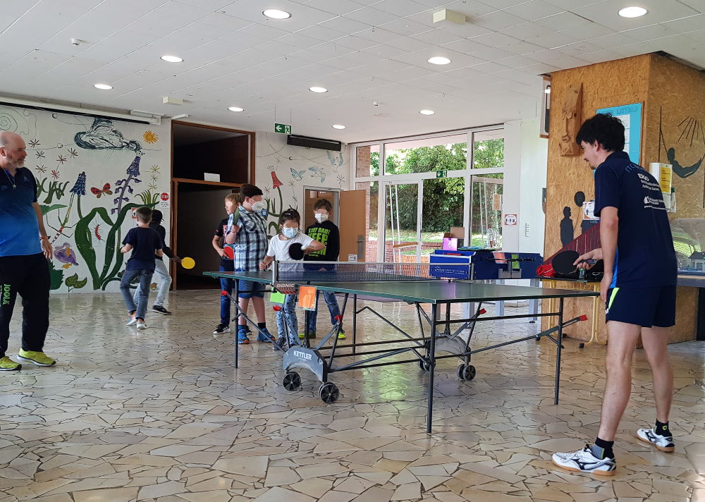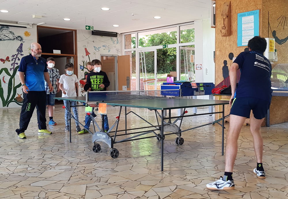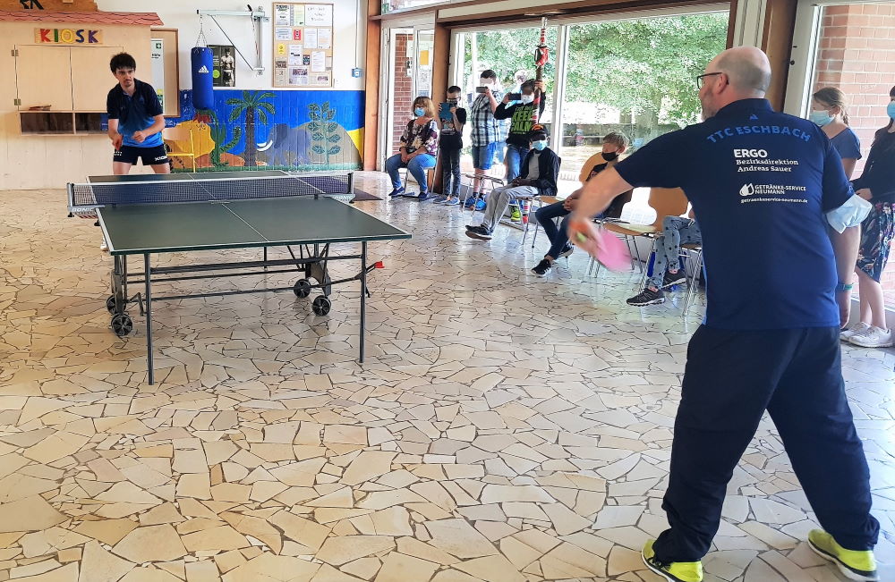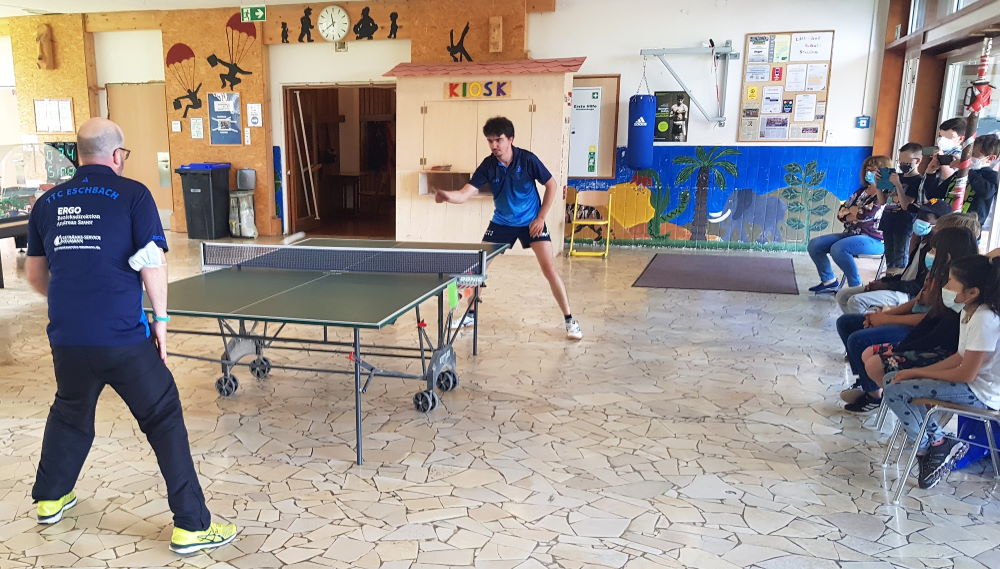 In der Förderschule Lilienhofschule in Staufen im Breisgau nur knapp 6 km entfernt von unserem Eschbach gibt es viele Angebote für die Kinder. Darunter befindet sich auch eine Tischtennistennisplatte, welche mal früher von unserem 1. Vereinsvorsitzenden Jens Meyer in die Schule gebracht wurde, damit die Kinder dort mehr Abwechslung haben. Die Kinder spielen immer wieder regelmässig dort an der Platte und da Jens beruflich des Öfteren in der Schule unterwegs ist, gibt er dann ab und zu Tischtennis-Tipps und zeigt den Kindern, wie es geht. Um das Ganze einmal etwas spannender gestalten zu können, lud Jens im Juni 2021 aus der ersten Herrenbezirksligamannschaft des TTCE den Spieler Maciek Helbin aus dem vorderen Paarkreuz zu einem Tischtennis-Showkampf in die Schule ein.